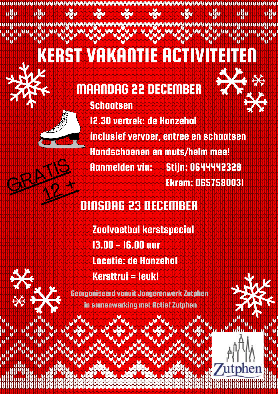 Tijdens de kerstvakantie organiseert Jongerenwerk Zutphen in samenwerking met Actief Zutphen twee superleuke, gratis activiteiten voor jongeren vanaf 12 jaar. Doe mee en beleef een sportieve en gezellige start van de feestdagen!