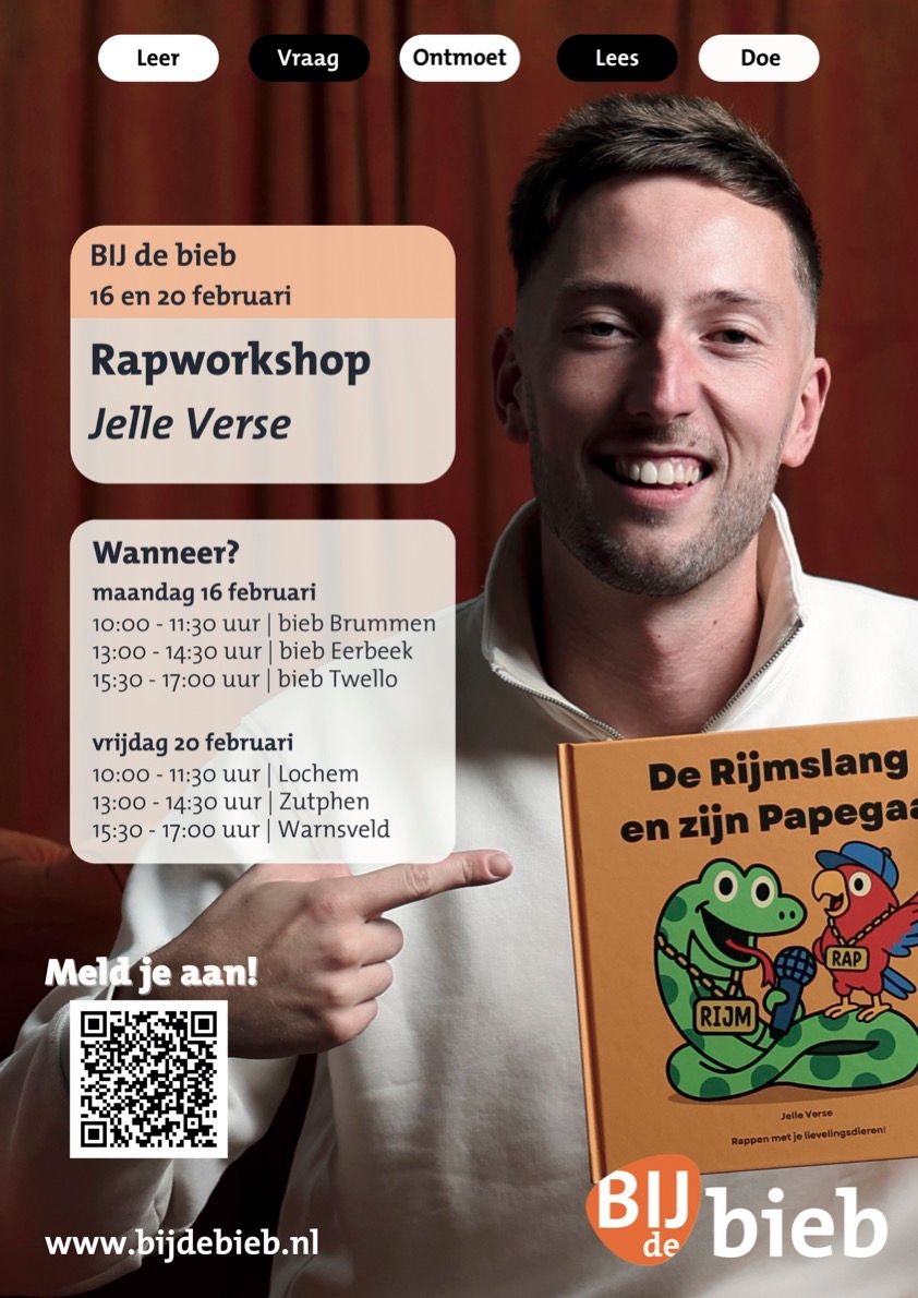 Jelle is een rapper én schrijver die kinderen op een speelse manier meeneemt in de wereld van taal en verhalen. Hij weet lezen en rijmen extra spannend te maken, soms zelfs met hulp van zijn vrolijke papegaai én QR-codes die je meteen naar zijn rapliedjes brengen. 🎶🦜